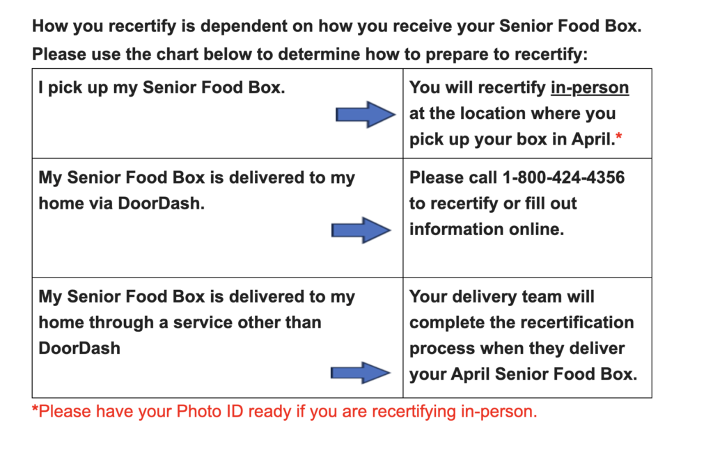 Every month, the Senior Food Box Program provides over 2,000 seniors with a free box of food to help stretch their incomes and improve their nutritional health. Boxes typically include milk, juice, canned meat, poultry, or fish, oats, ready-to-eat cereal, rice, pasta, dry beans, peanut butter, and canned fruits and vegetables.