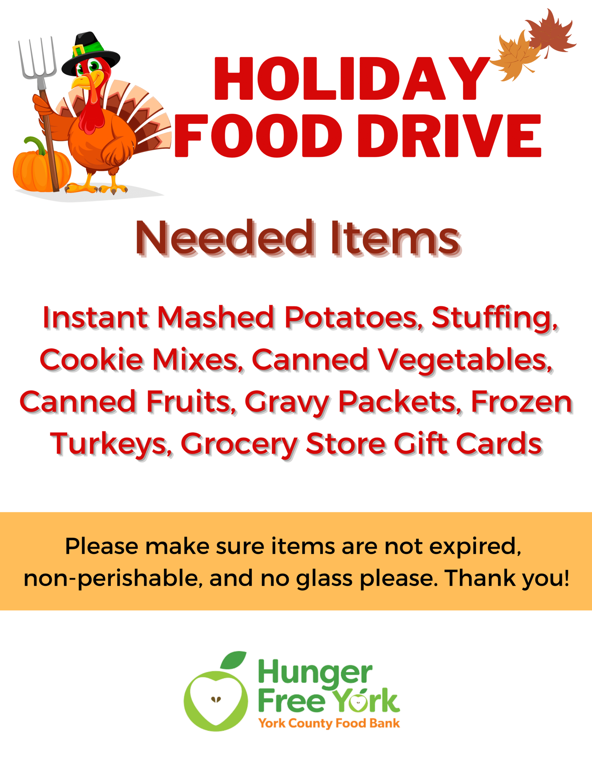 Make your food drive a success! Use our ready-to-print flyer to let friends, coworkers, and neighbors know what to bring. Every can and box helps fill plates across York County this holiday season. Click here to download.